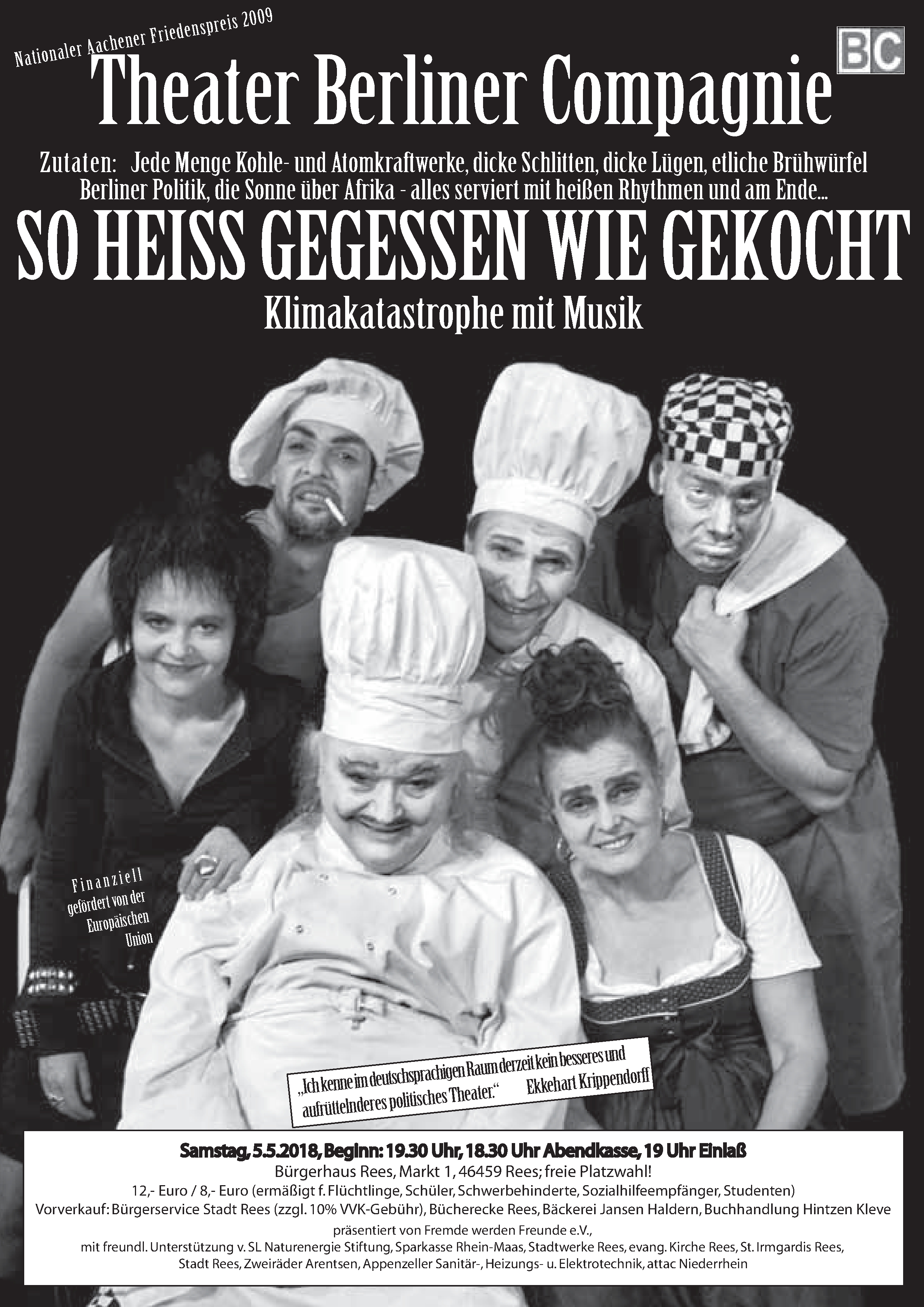 Die Flüchtlingsinitiative Fremde werden Freunde e.V. präsentierte am Samstag, dem 5.5.2018 um 19.30 Uhr die Theatergruppe „Berliner Compagnie“ mit ihrem Stück „So heiß gegessen wie gekocht – Klimakatastrophe mit Musik“ zum Thema Klimawandel im Bürgerhaus Rees. Die Aufführung beeindruckte durch die ihr zugrunde liegende akribische Recherche und eine mitreißende Umsetzung und stellte für Rees eine Premiere dar. Gleichzeitig war es die letzte Möglichkeit, sich dieses Stück anzuschauen, da seine Aufführung nach 8 erfolgreichen Jahren eingestellt wurde.