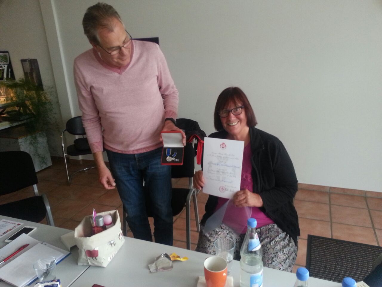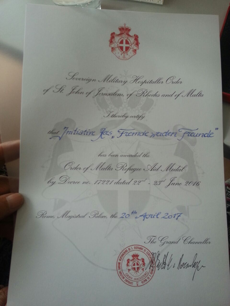 Am Donnerstag, dem 4.5.2017 zeichnete Dr. Martin Altenburger, stellvertretender Diözesanleiter bei den Maltesern im Bistum Münster, 57 ehren- wie hauptamtliche Mitarbeiter aus, die in der Flüchtlingshilfe aktiv sind, sowie neun Vertreter diverser Vereine, Einrichtungen und Ärzte für ihr Engagement.Nach einer Ansprache überreichte Altenburger den Helfern die „Order of Malta Refugee Aid Medal“ in dreifacher Ausführung in einem roten Etui mit weißem Malteserkreuz sowie eine entsprechende Urkunde. Stellvertretend für „Fremde werden Freunde“ wurden Frau Anne Wagner einen Tag später von Herrn Hans-Heinrich Müllers (Malteser, ZUE Rees) Orden und Urkunde überreicht. …