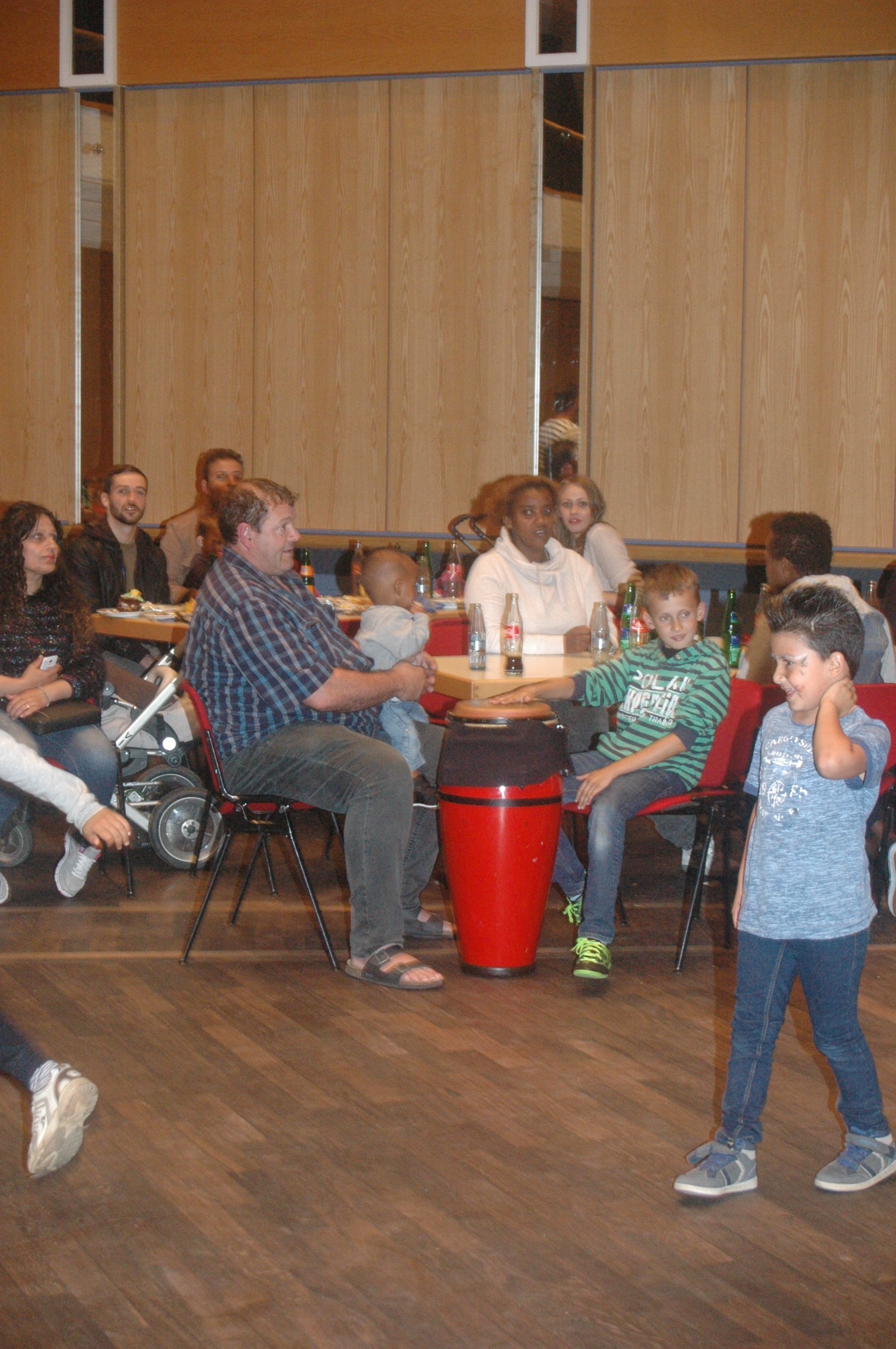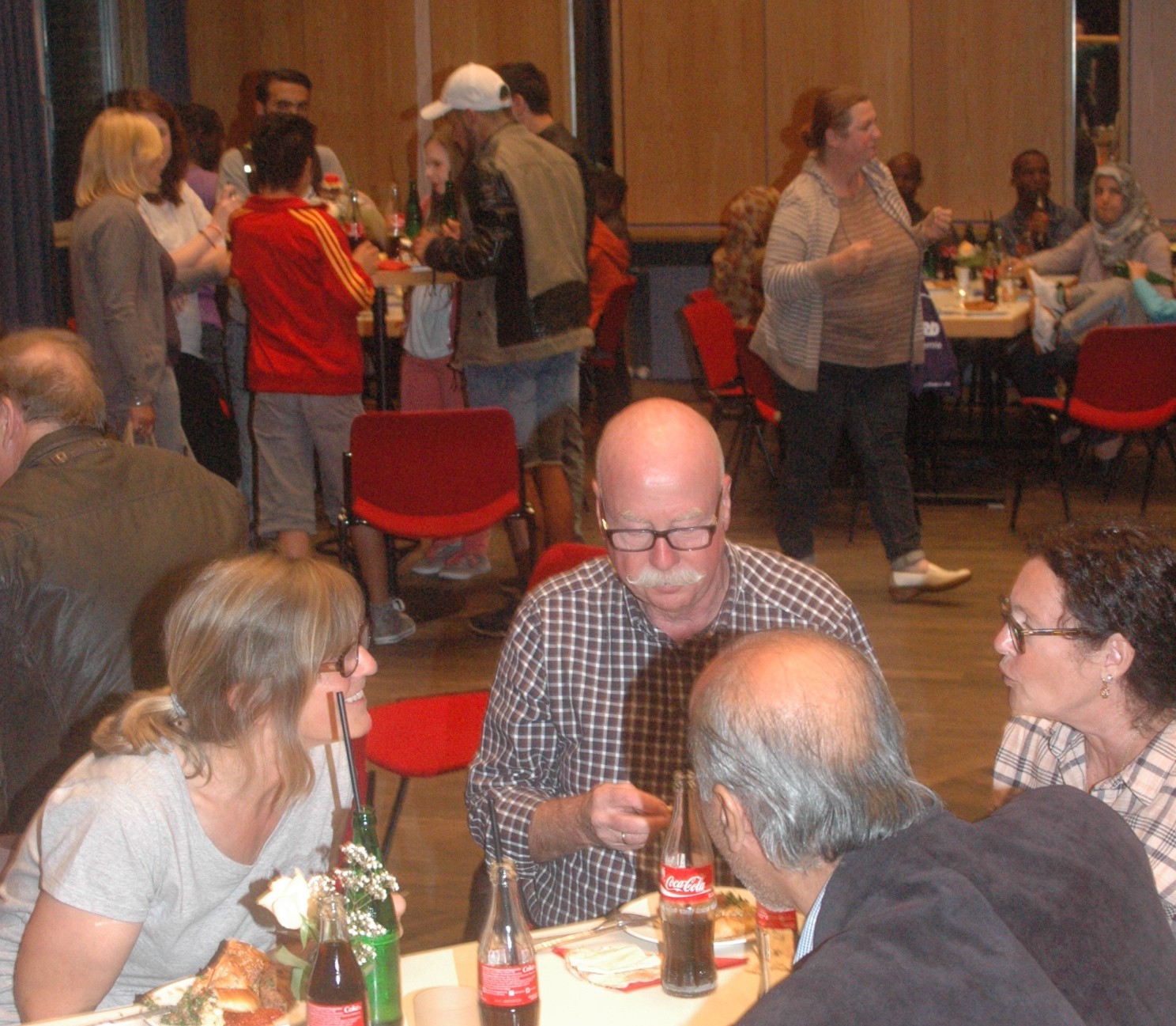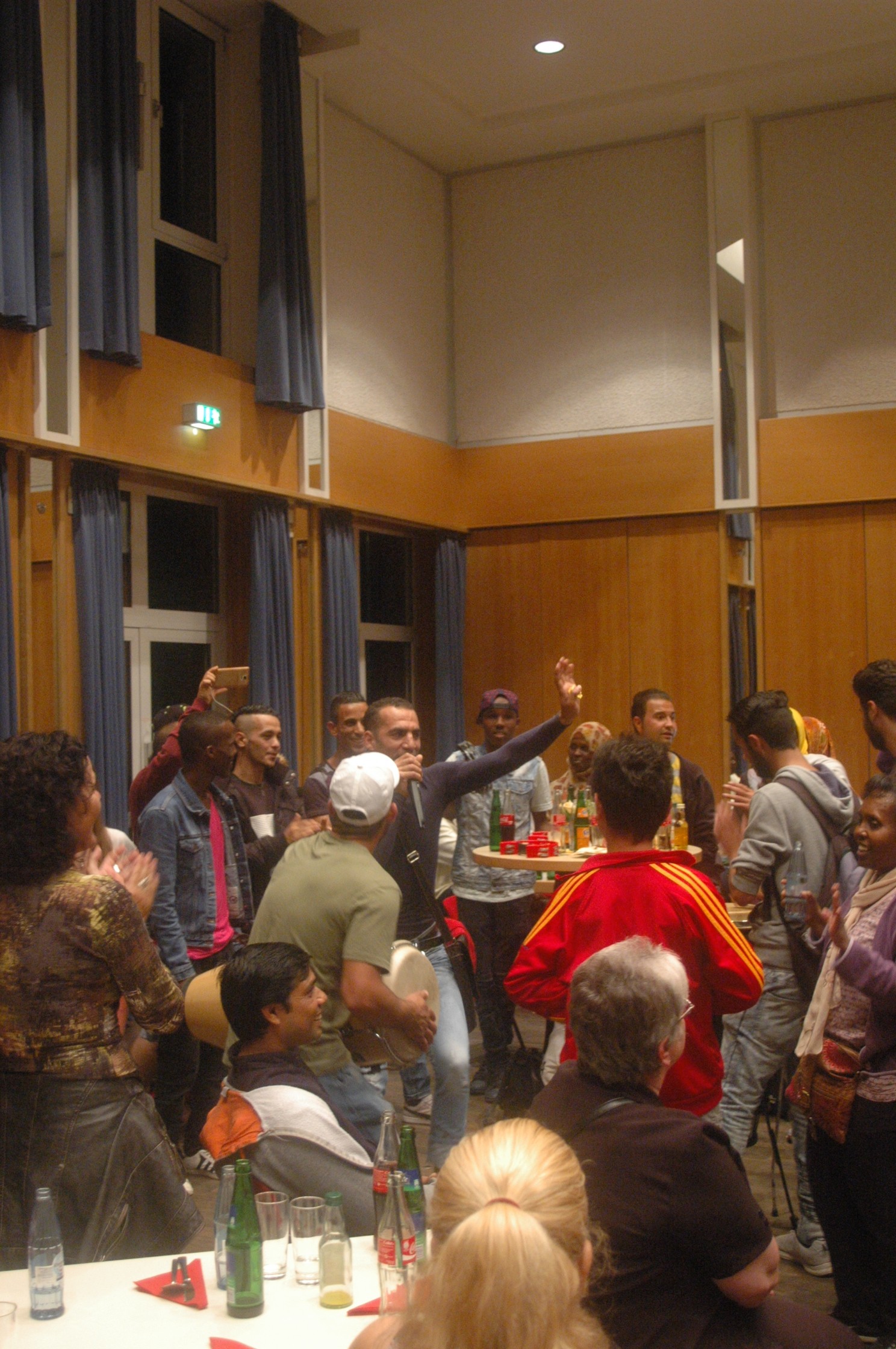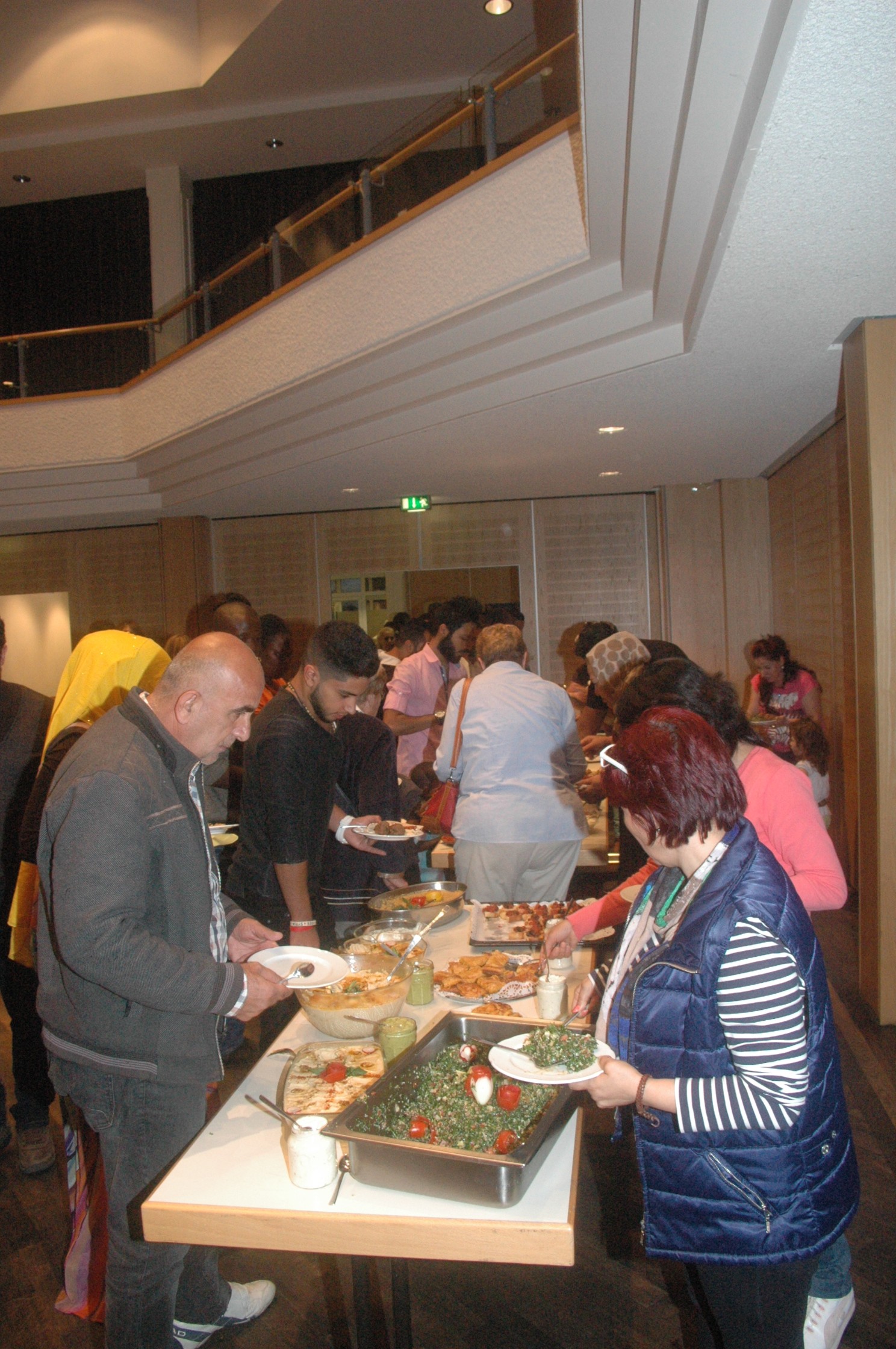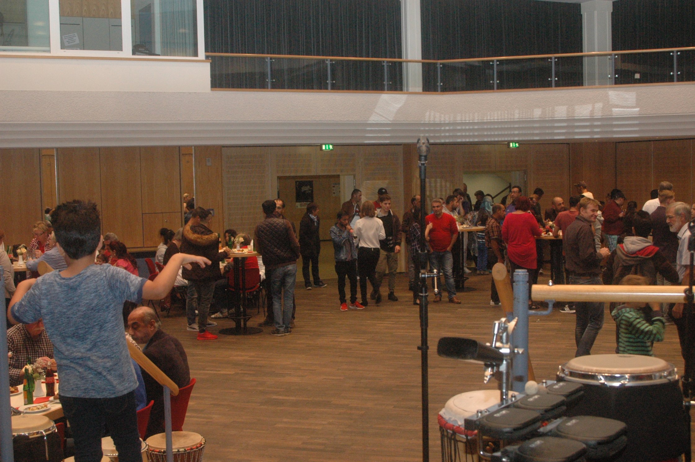 Nach einem gut besuchten Gottesdienst mit Abendmahl in der evangelischen Kirche als Eröffnungsveranstaltung der Interkulturellen Woche Rees am Vortag trafen sich am Montag, dem 19. September 2016 abends um 19 Uhr ca. 200 Reeser, in Rees lebende Flüchtlinge und auch Besucher von außerhalb im Bürgerhaus. Nach einem köstlichen Buffet mit von vielen Händen selbstgemachten Speisen aus aller Welt wurde ein kurzes Theaterstück der neugegründeten Gruppe „Darabisch“ unter Leitung von Silja Böhling-Buhl zum Thema Sprache aufgeführt, welches mit großem Applaus bedacht wurde. Anschließend sorgten 3 Musiker aus Wesel unter der Leitung von Stefan Schnelting mit ihren mitgebrachten Trommeln und anderen Instrumenten für Stimmung und die Anwesenden brachten sich spontan und sichtlich erfreut mit Gesang und Tanz verschiedenster Couleur mit ein, womit der Abend einen schwungvollen Abschluß fand.