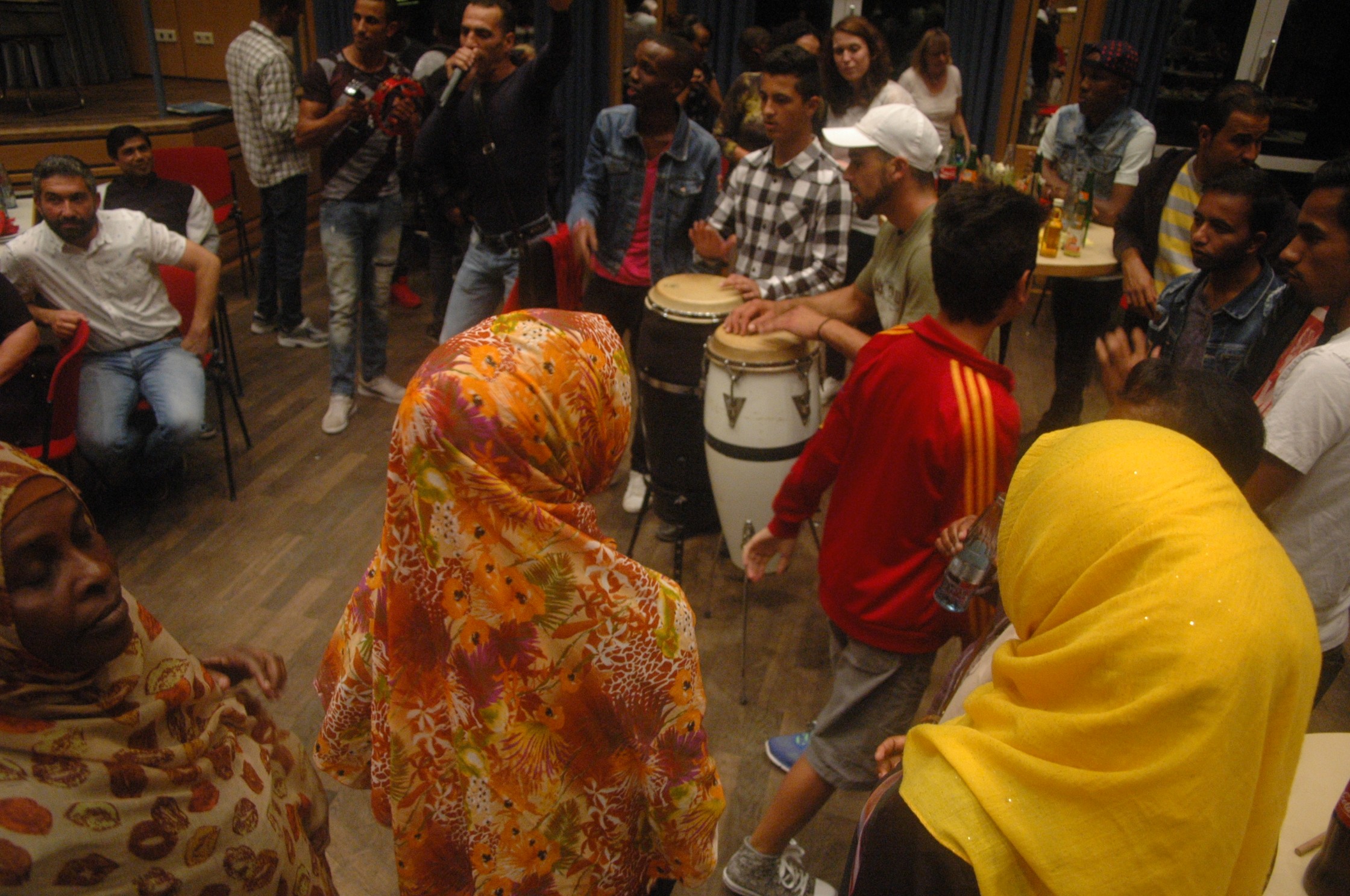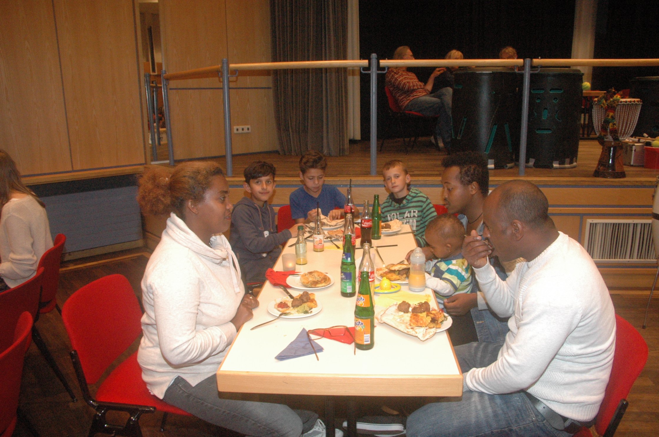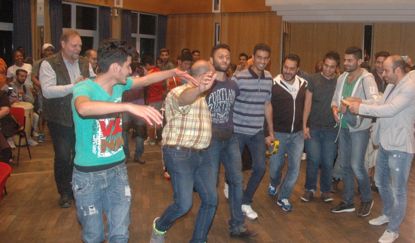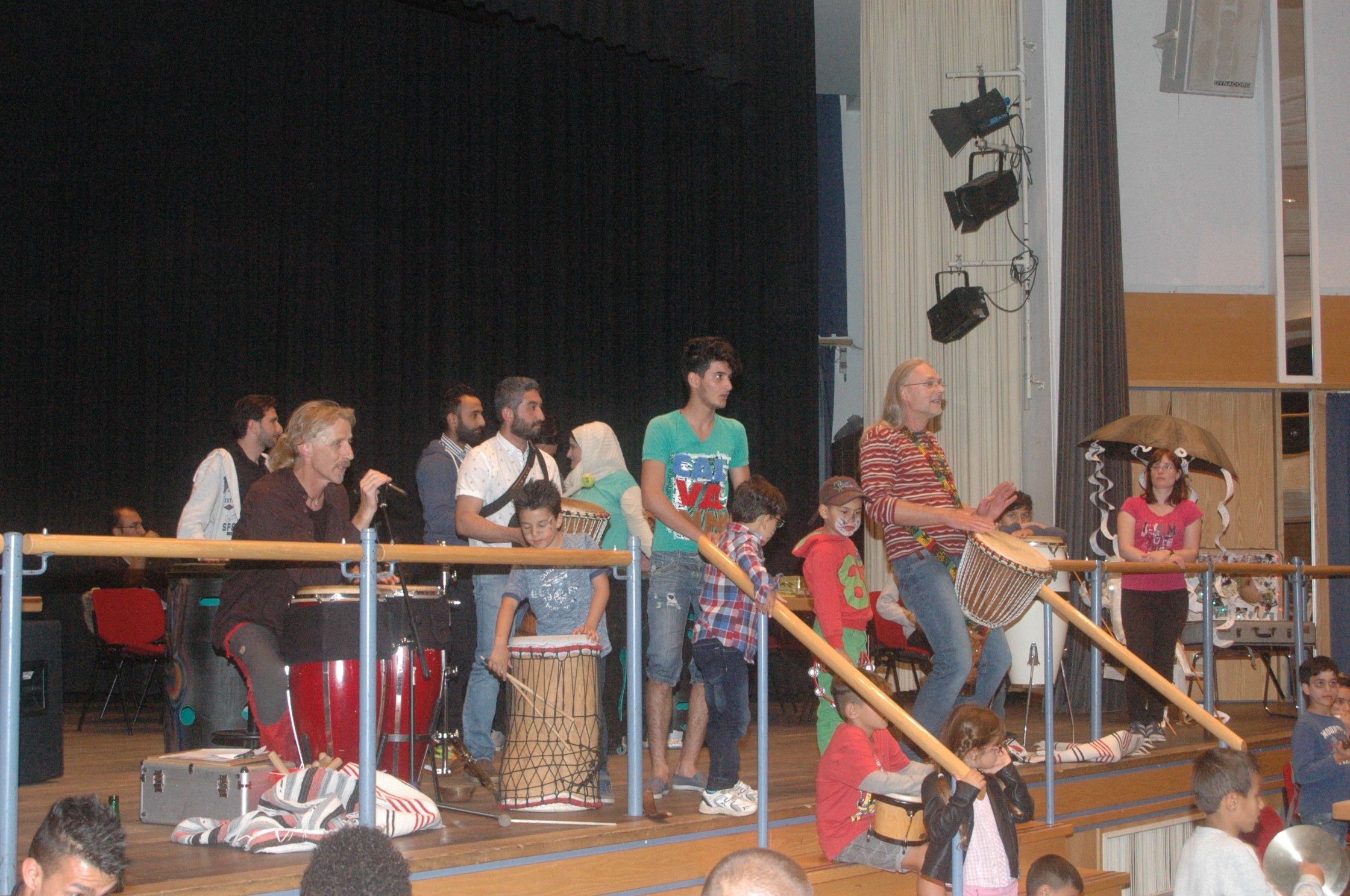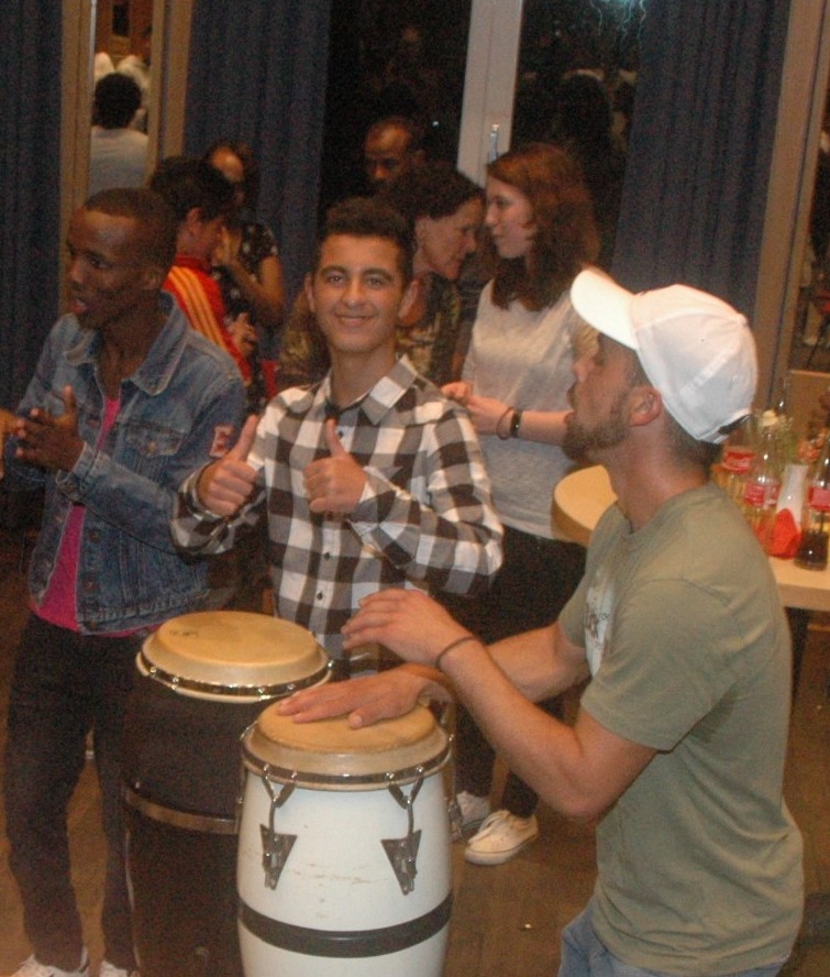 Nach einem gut besuchten Gottesdienst mit Abendmahl in der evangelischen Kirche als Eröffnungsveranstaltung der Interkulturellen Woche Rees am Vortag trafen sich am Montag, dem 19. September 2016 abends um 19 Uhr ca. 200 Reeser, in Rees lebende Flüchtlinge und auch Besucher von außerhalb im Bürgerhaus. Nach einem köstlichen Buffet mit von vielen Händen selbstgemachten Speisen aus aller Welt wurde ein kurzes Theaterstück der neugegründeten Gruppe „Darabisch“ unter Leitung von Silja Böhling-Buhl zum Thema Sprache aufgeführt, welches mit großem Applaus bedacht wurde. Anschließend sorgten 3 Musiker aus Wesel unter der Leitung von Stefan Schnelting mit ihren mitgebrachten Trommeln und anderen Instrumenten für Stimmung und die Anwesenden brachten sich spontan und sichtlich erfreut mit Gesang und Tanz verschiedenster Couleur mit ein, womit der Abend einen schwungvollen Abschluß fand.