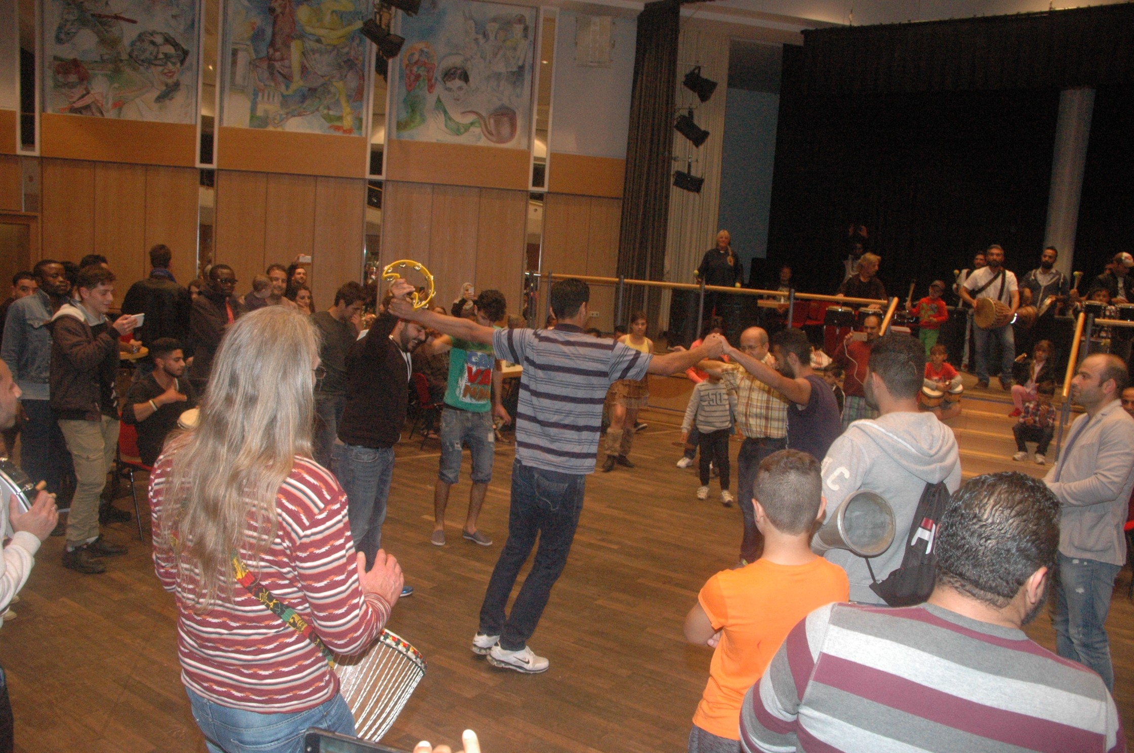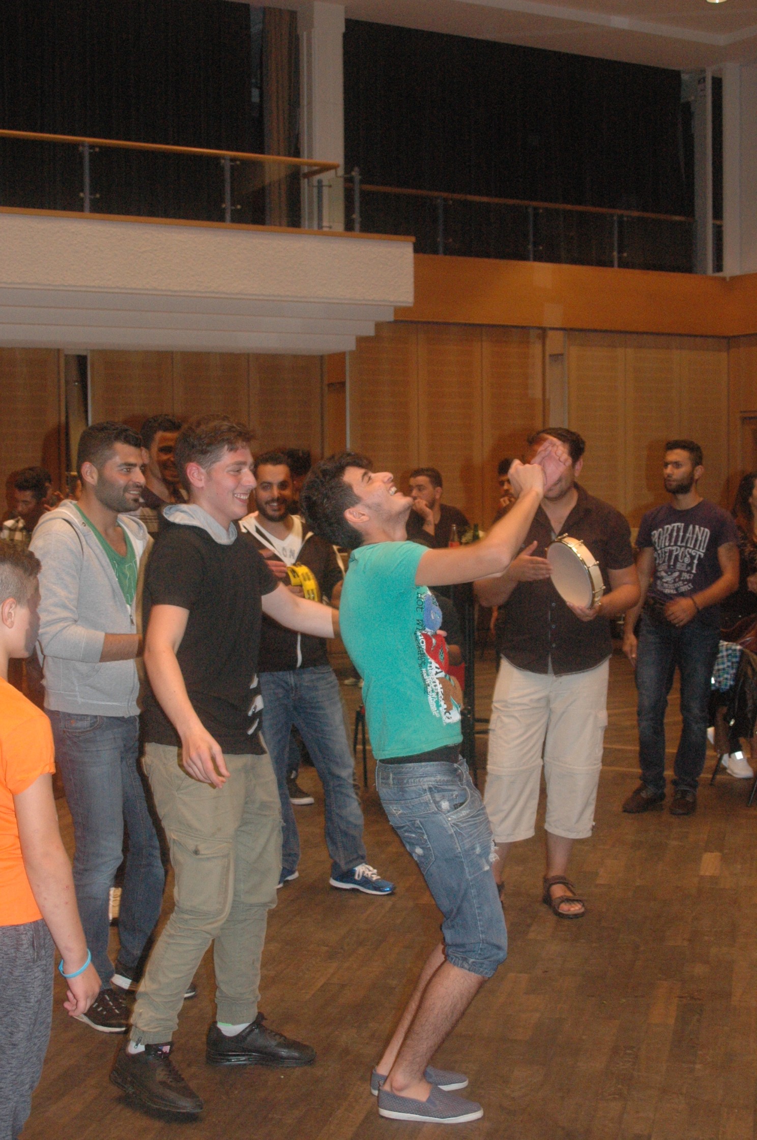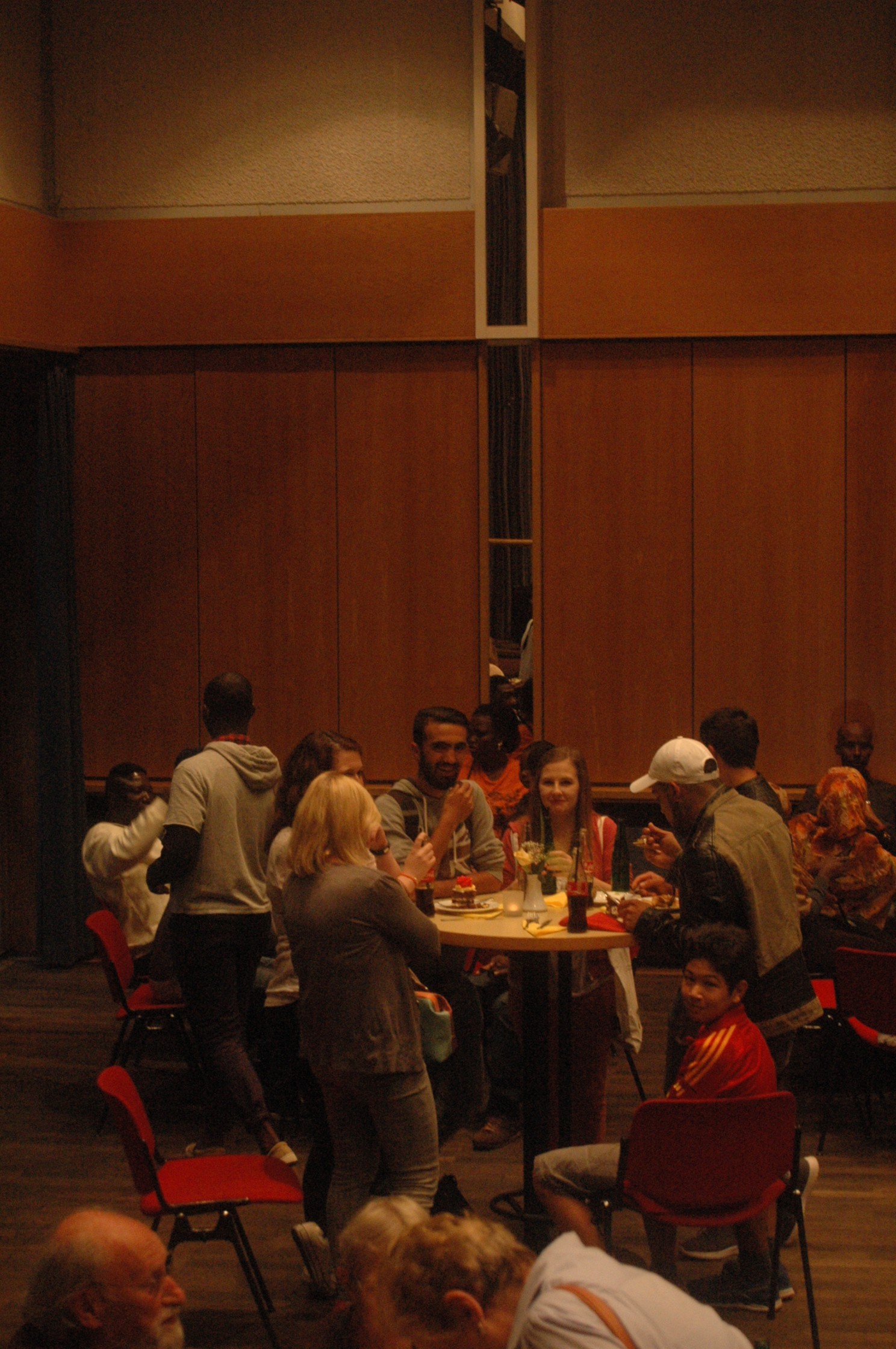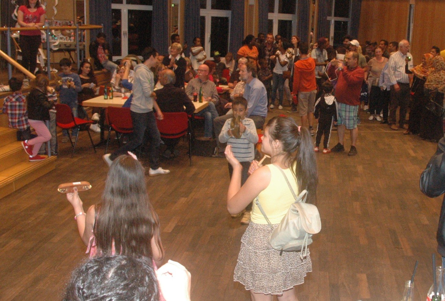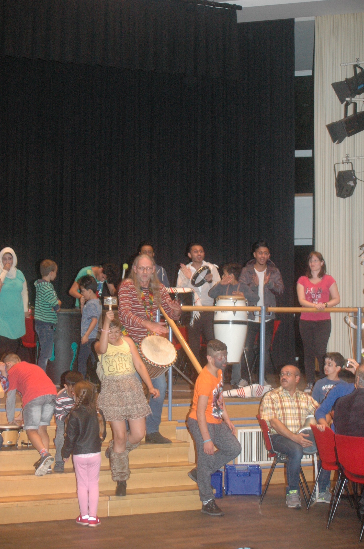 Nach einem gut besuchten Gottesdienst mit Abendmahl in der evangelischen Kirche als Eröffnungsveranstaltung der Interkulturellen Woche Rees am Vortag trafen sich am Montag, dem 19. September 2016 abends um 19 Uhr ca. 200 Reeser, in Rees lebende Flüchtlinge und auch Besucher von außerhalb im Bürgerhaus. Nach einem köstlichen Buffet mit von vielen Händen selbstgemachten Speisen aus aller Welt wurde ein kurzes Theaterstück der neugegründeten Gruppe „Darabisch“ unter Leitung von Silja Böhling-Buhl zum Thema Sprache aufgeführt, welches mit großem Applaus bedacht wurde. Anschließend sorgten 3 Musiker aus Wesel unter der Leitung von Stefan Schnelting mit ihren mitgebrachten Trommeln und anderen Instrumenten für Stimmung und die Anwesenden brachten sich spontan und sichtlich erfreut mit Gesang und Tanz verschiedenster Couleur mit ein, womit der Abend einen schwungvollen Abschluß fand.