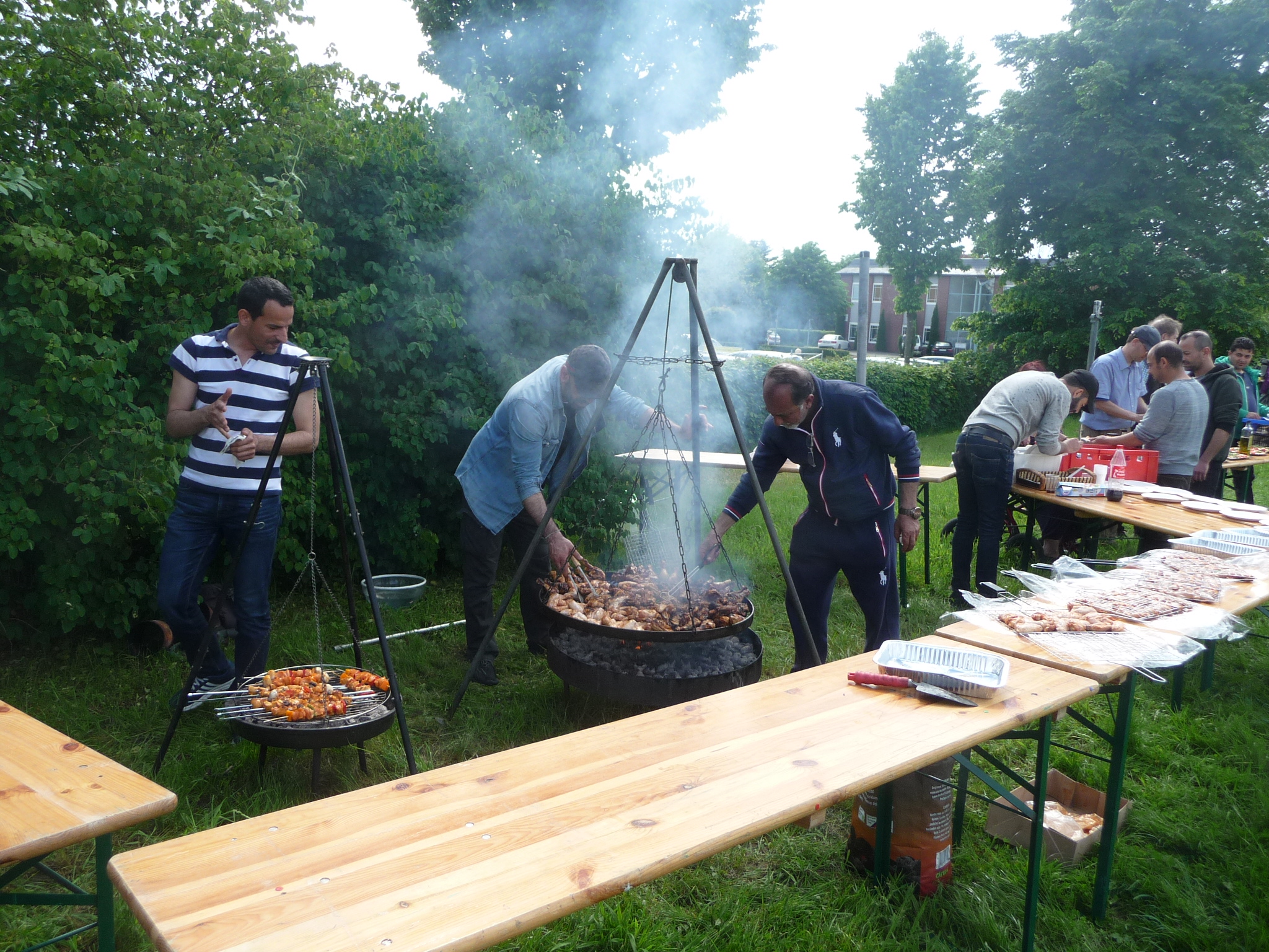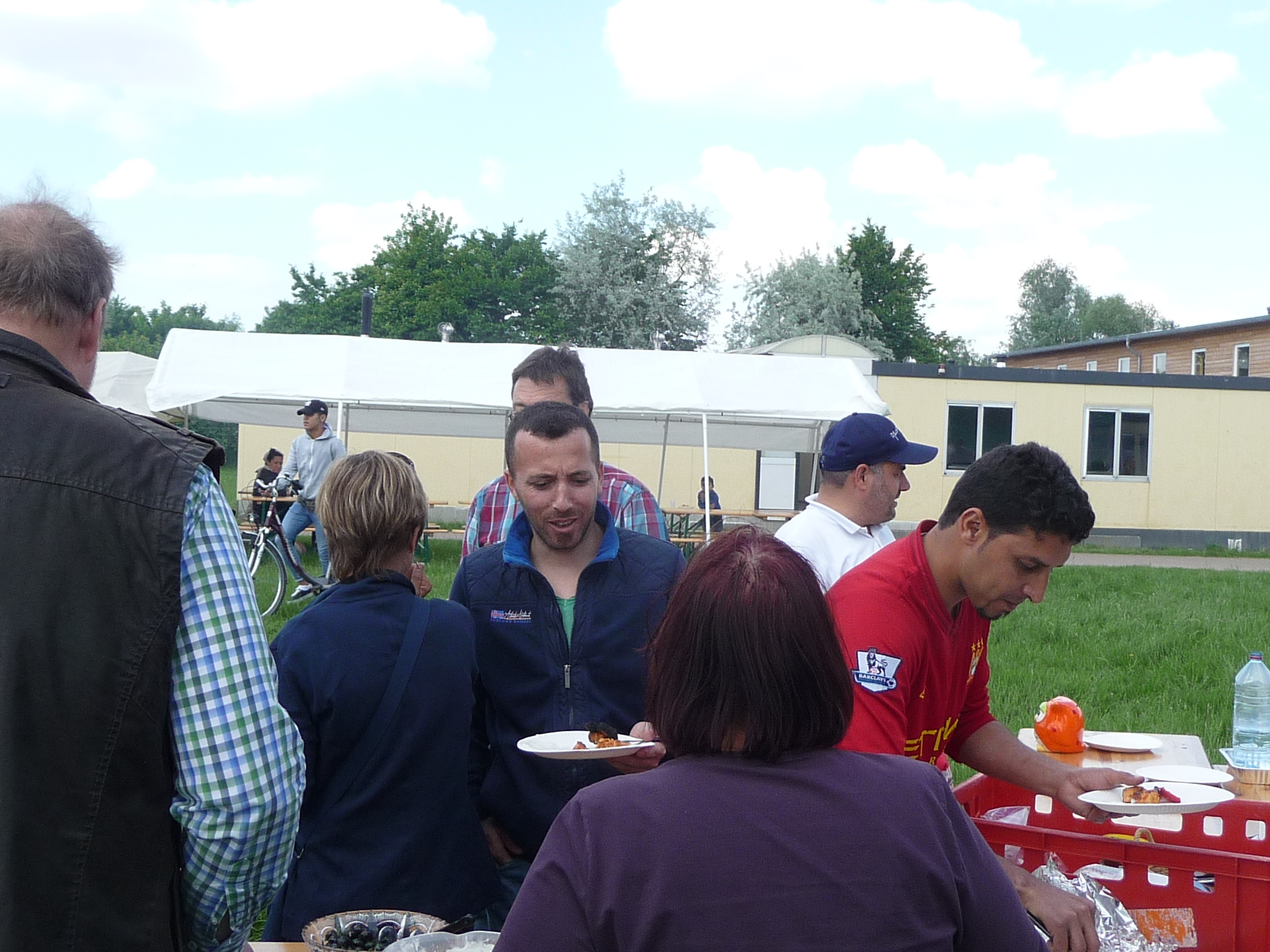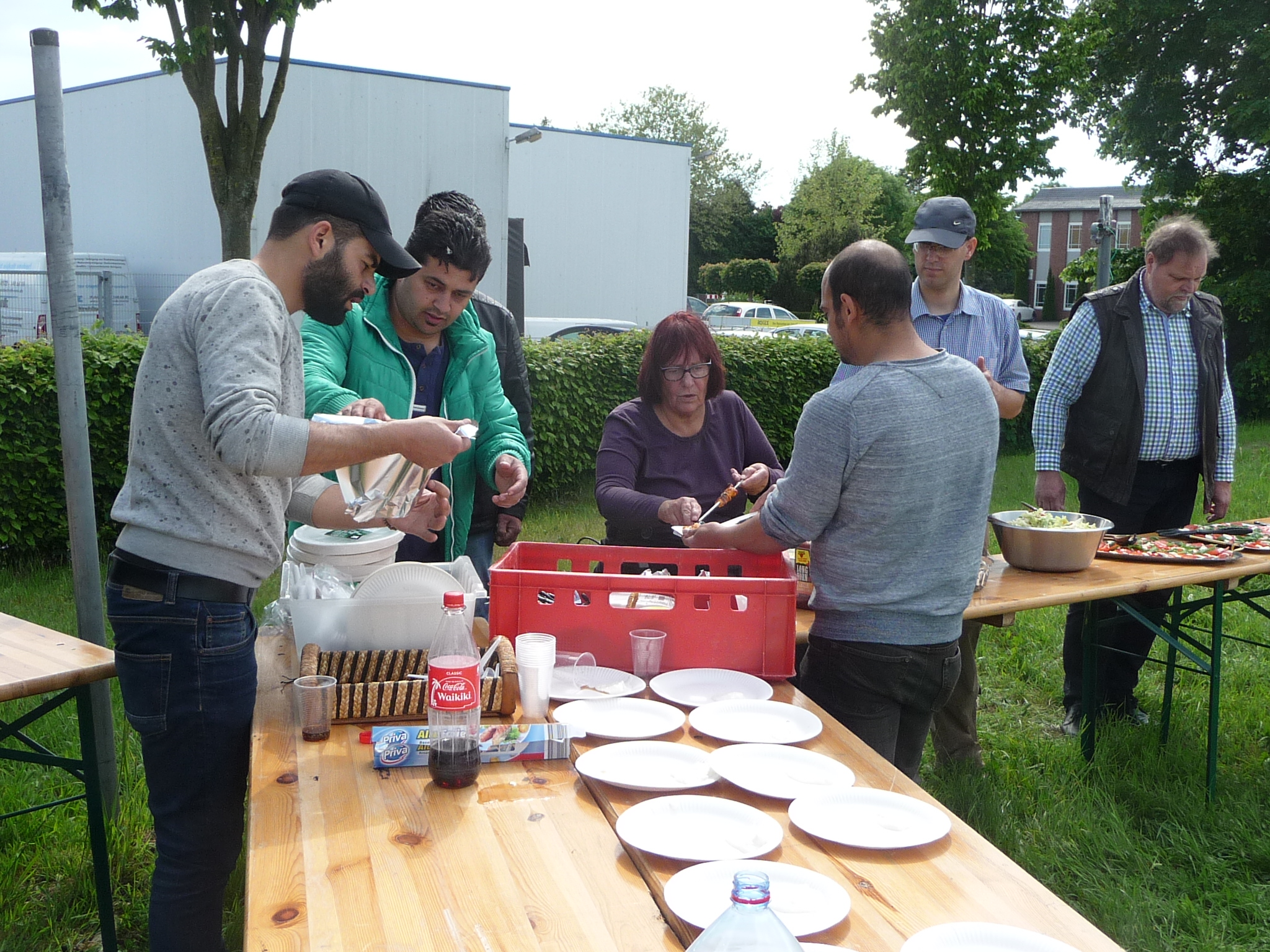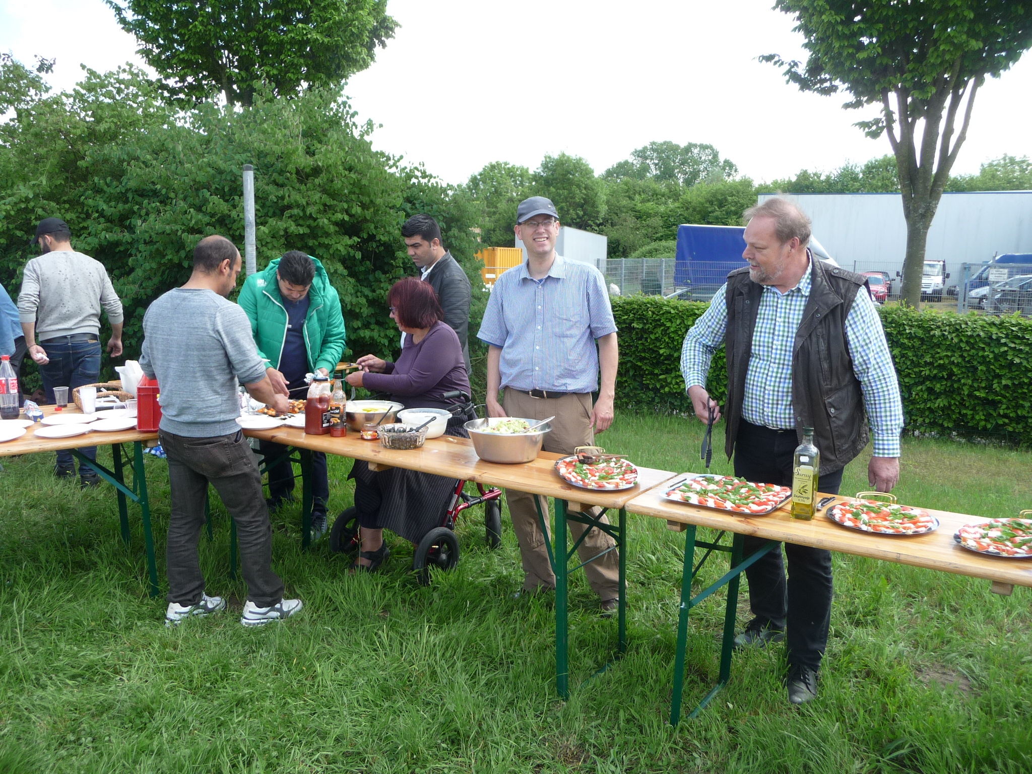 Mit freundlicher Unterstützung von Beate Schams, „Arabische Spezialitäten“ Rees, wurde im Vorfeld eingekauft und zusammen mit Flüchtlingen Salate und andere Speisen zubereitet. Auch der Auf- und Abbbau von Zelten und Tischen und das Grillen ging Hand in Hand, so daß der teils windige aber überwiegend sonnige Nachmittag in guter Stimmung und im Gespräch miteinander verbracht wurde.