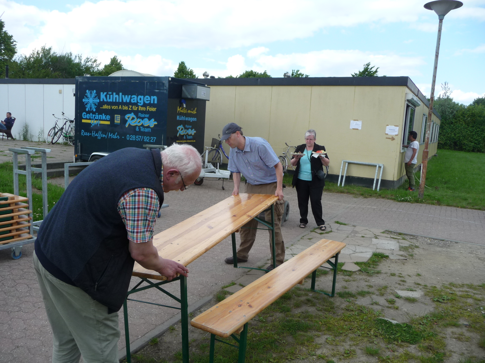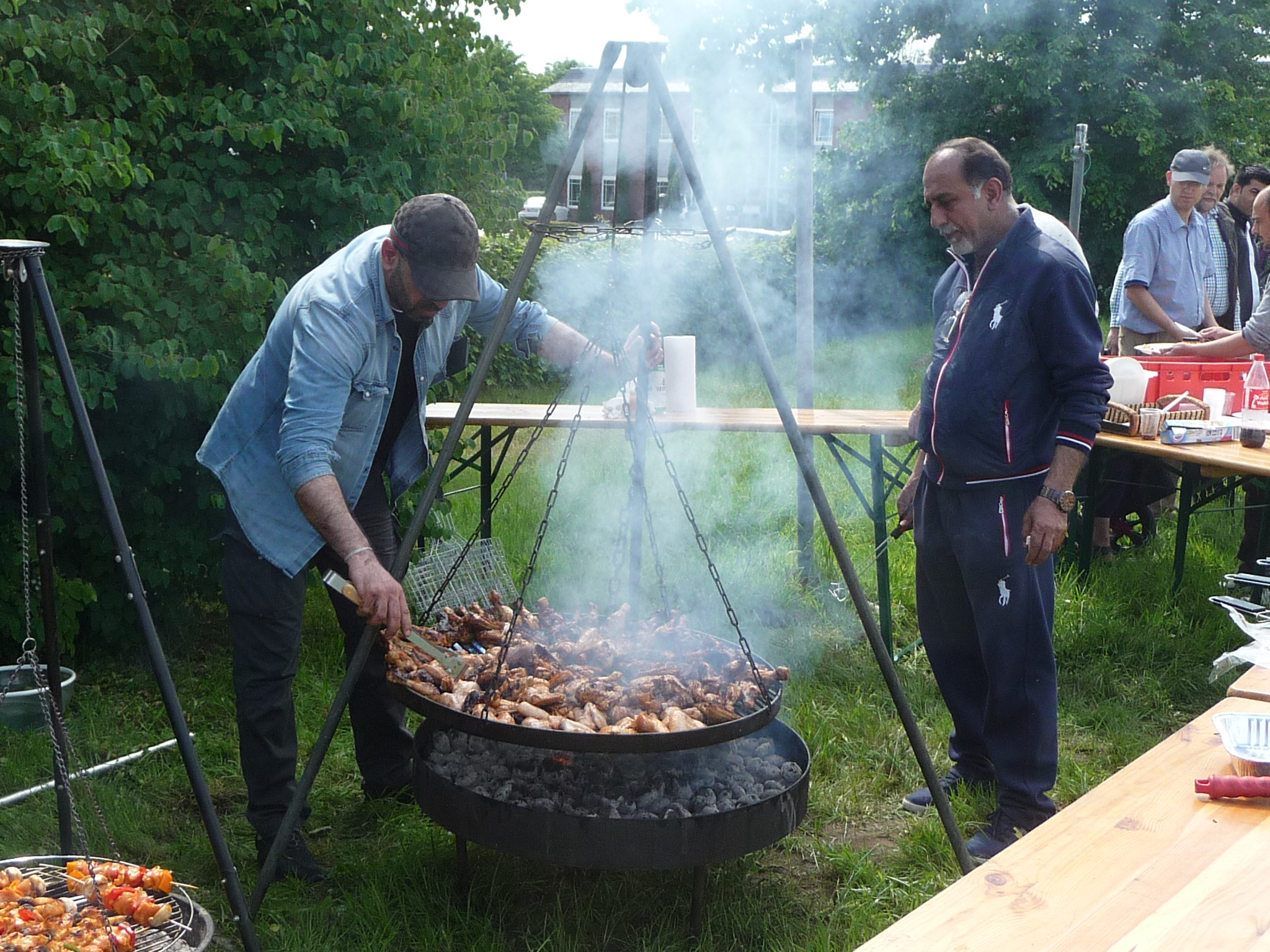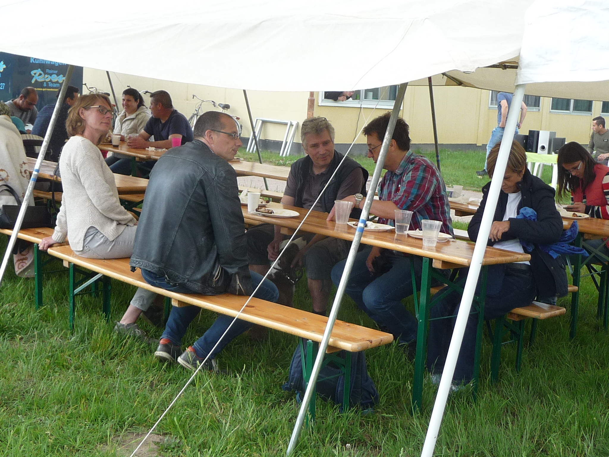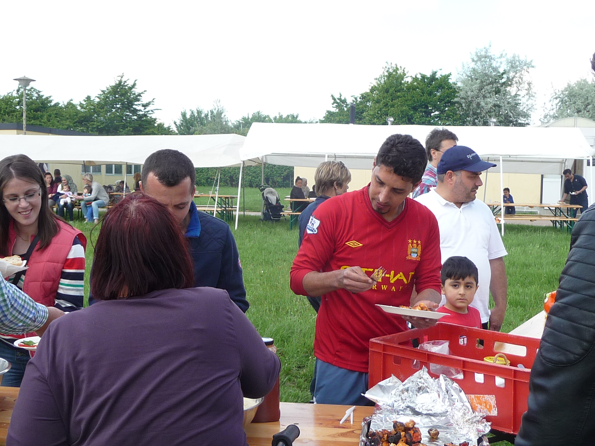 Mit freundlicher Unterstützung von Beate Schams, „Arabische Spezialitäten“ Rees, wurde im Vorfeld eingekauft und zusammen mit Flüchtlingen Salate und andere Speisen zubereitet. Auch der Auf- und Abbbau von Zelten und Tischen und das Grillen ging Hand in Hand, so daß der teils windige aber überwiegend sonnige Nachmittag in guter Stimmung und im Gespräch miteinander verbracht wurde.